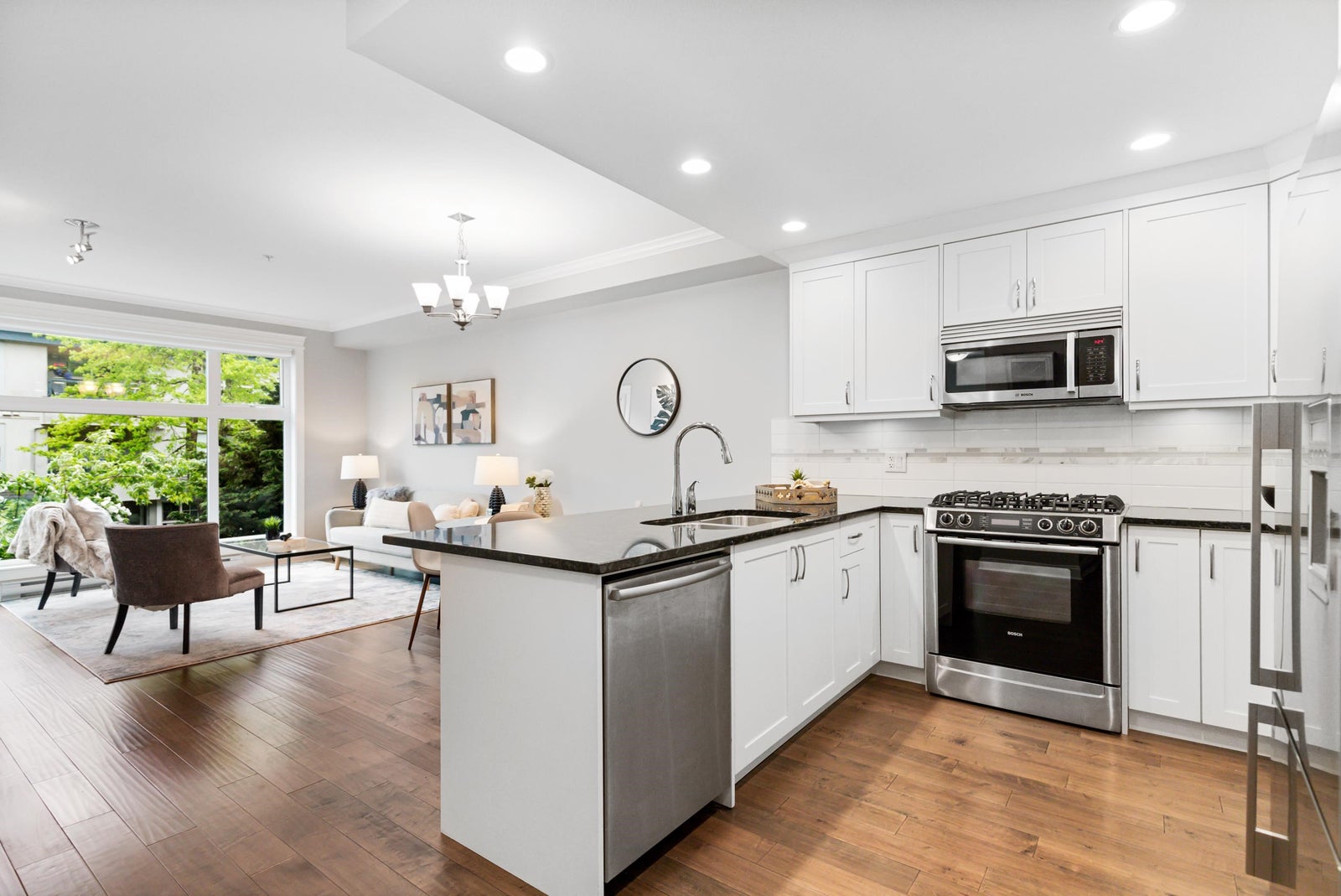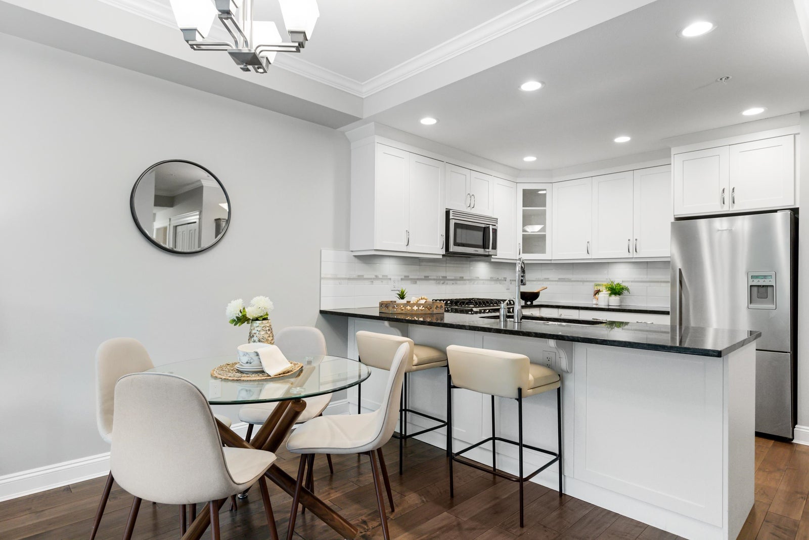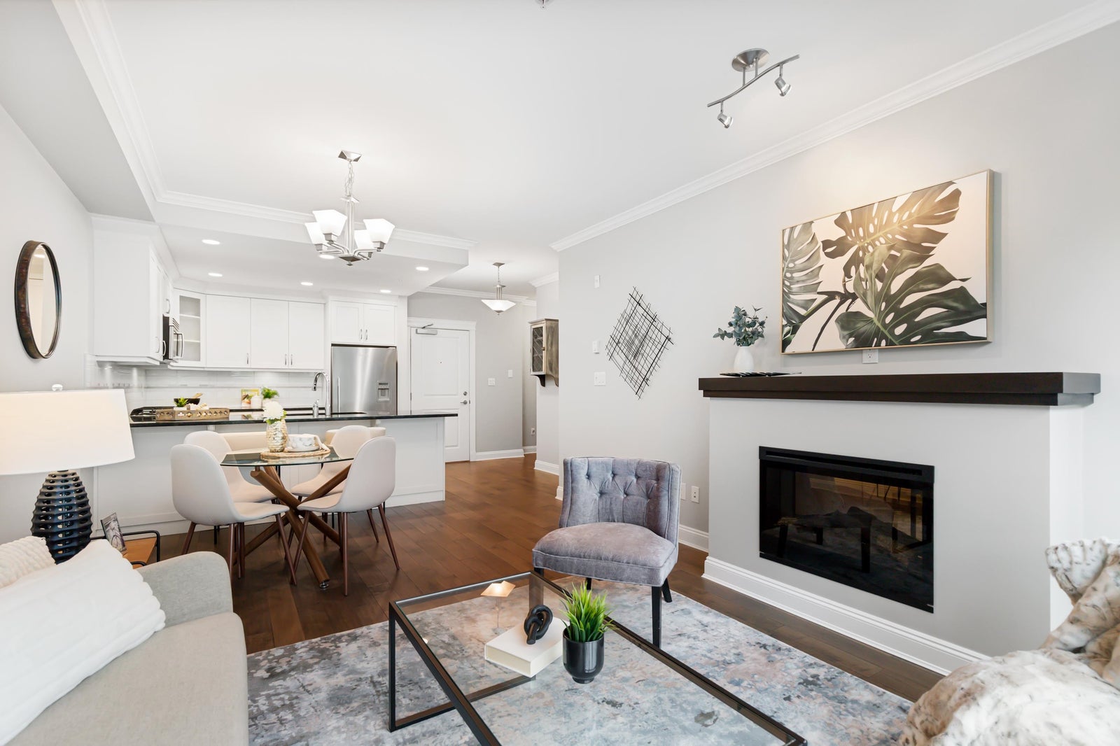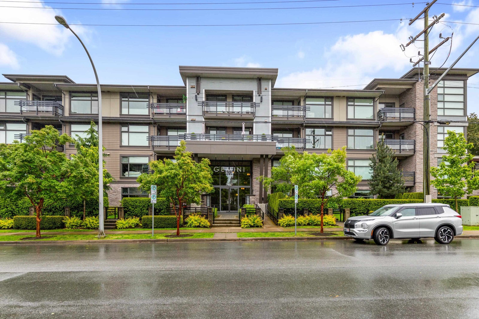 Welcome to Gemini I, located in the heart of South Surrey! This beautiful 976 SF unit features 2 bedrooms, 2 bathrooms & a large open main living area with 9' ceilings, flooded with natural light through the large south facing windows. Quality built by Genex, this unit is equipped with engineered hardwood floors, detailed mouldings & a well designed kitchen, appointed with quality shaker cabinets, granite countertops & SS appliances (gas stove). Spacious primary bedroom with a fabulous en-suite with heated floors, walk-in shower & double sink vanity. Well maintained, freshly painted and ready for its next owner! Fantastic amenities, including a guest suite, gym, outdoor BBQ area & two amenities rooms. Located steps to Semiahmoo Mall, Peace Arch Hospital & transit. Showings by appointment.