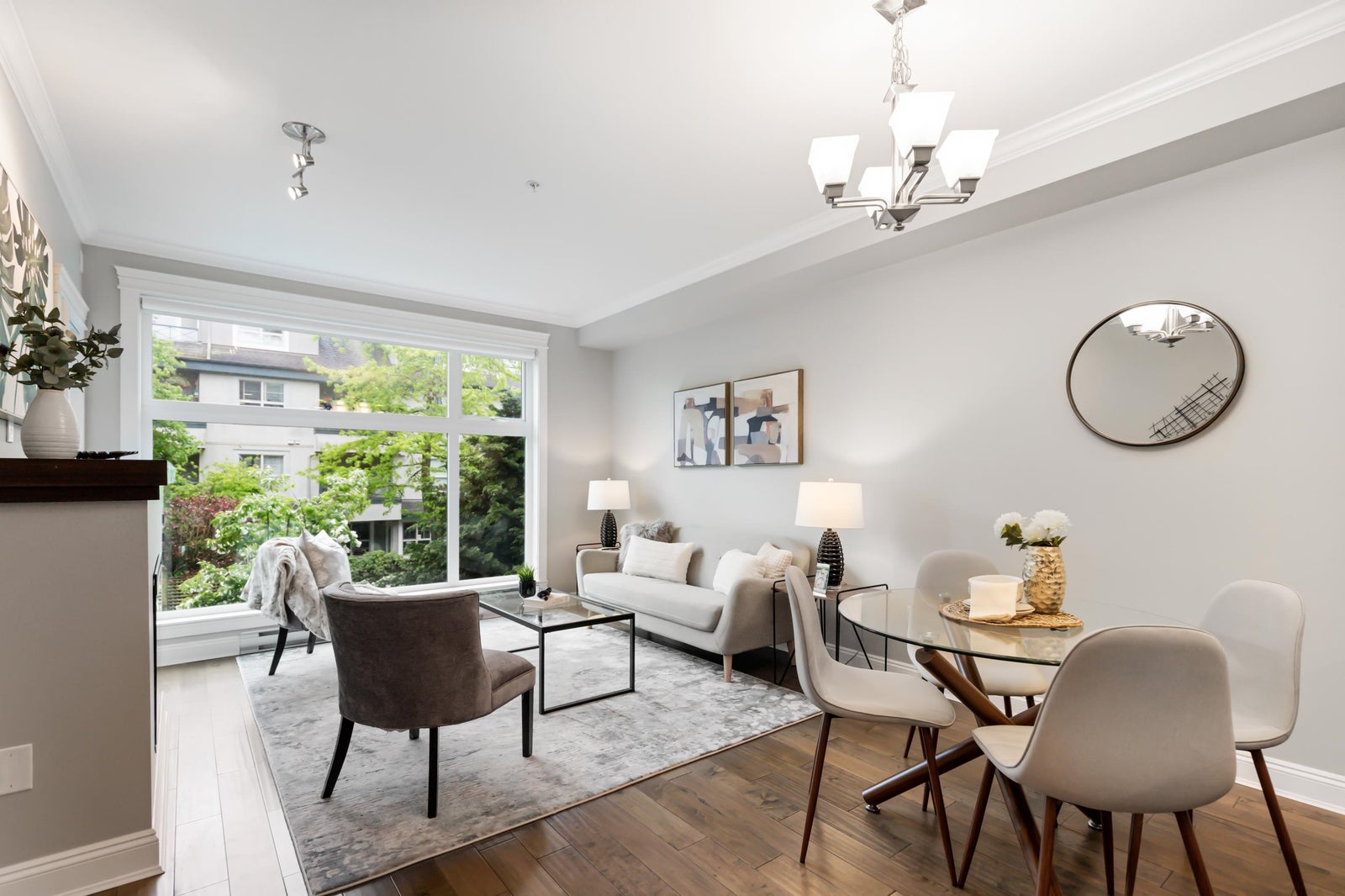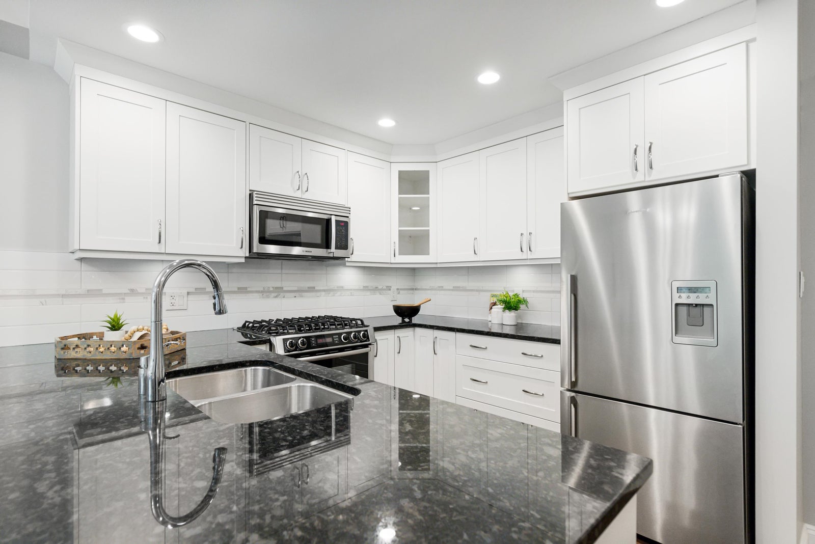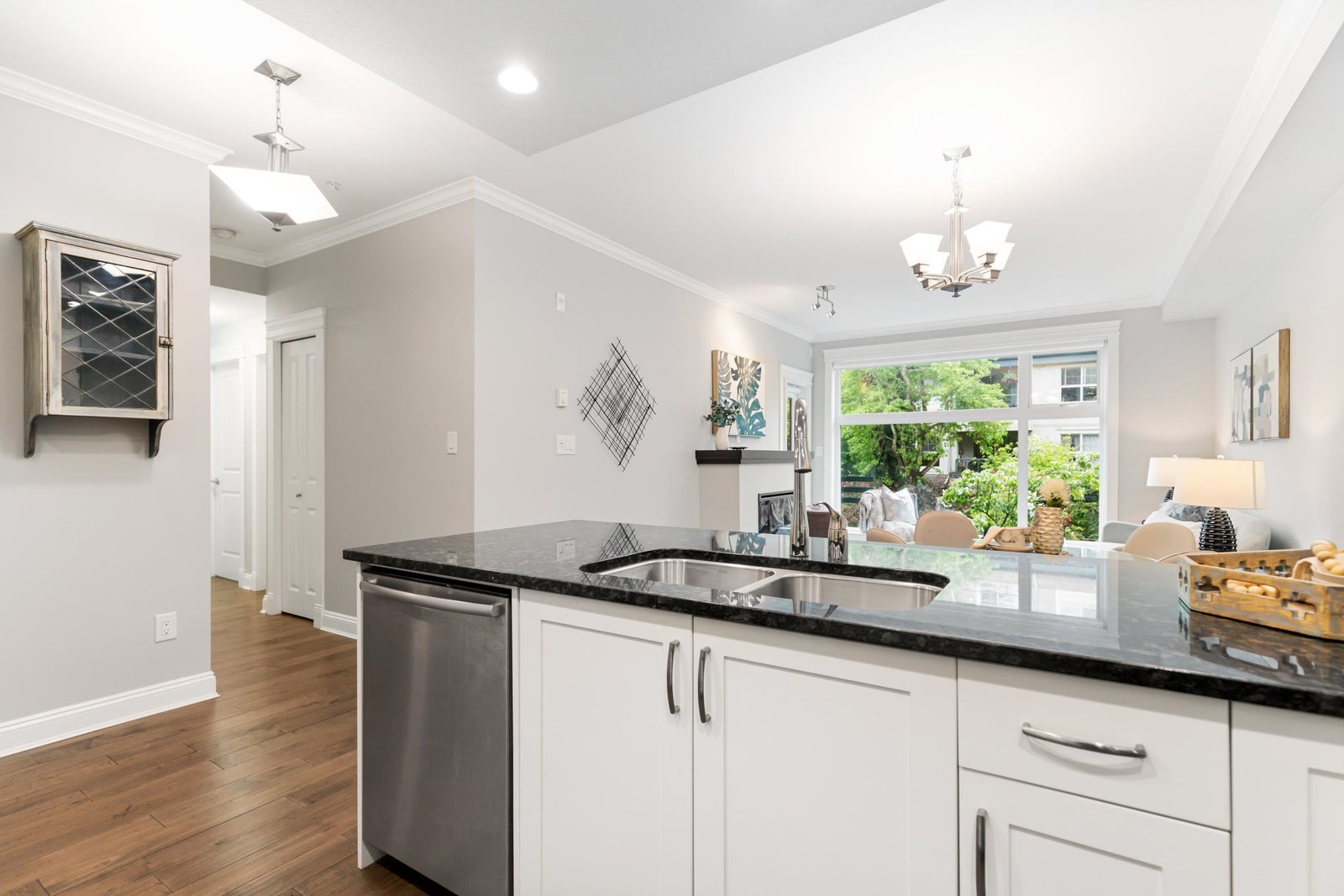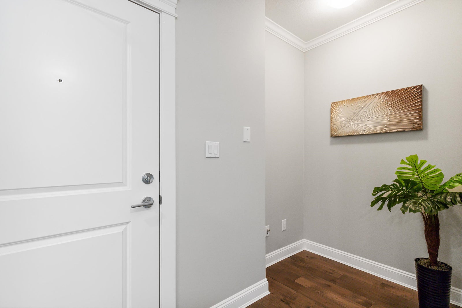 Welcome to Gemini I, located in the heart of South Surrey! This beautiful 976 SF unit features 2 bedrooms, 2 bathrooms & a large open main living area with 9' ceilings, flooded with natural light through the large south facing windows. Quality built by Genex, this unit is equipped with engineered hardwood floors, detailed mouldings & a well designed kitchen, appointed with quality shaker cabinets, granite countertops & SS appliances (gas stove). Spacious primary bedroom with a fabulous en-suite with heated floors, walk-in shower & double sink vanity. Well maintained, freshly painted and ready for its next owner! Fantastic amenities, including a guest suite, gym, outdoor BBQ area & two amenities rooms. Located steps to Semiahmoo Mall, Peace Arch Hospital & transit. Showings by appointment.