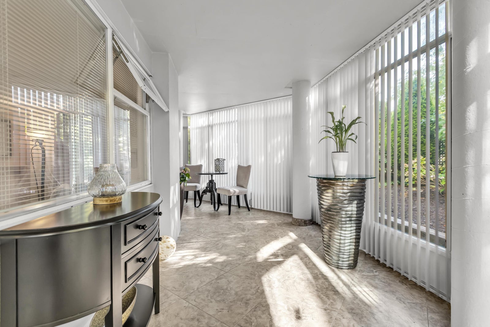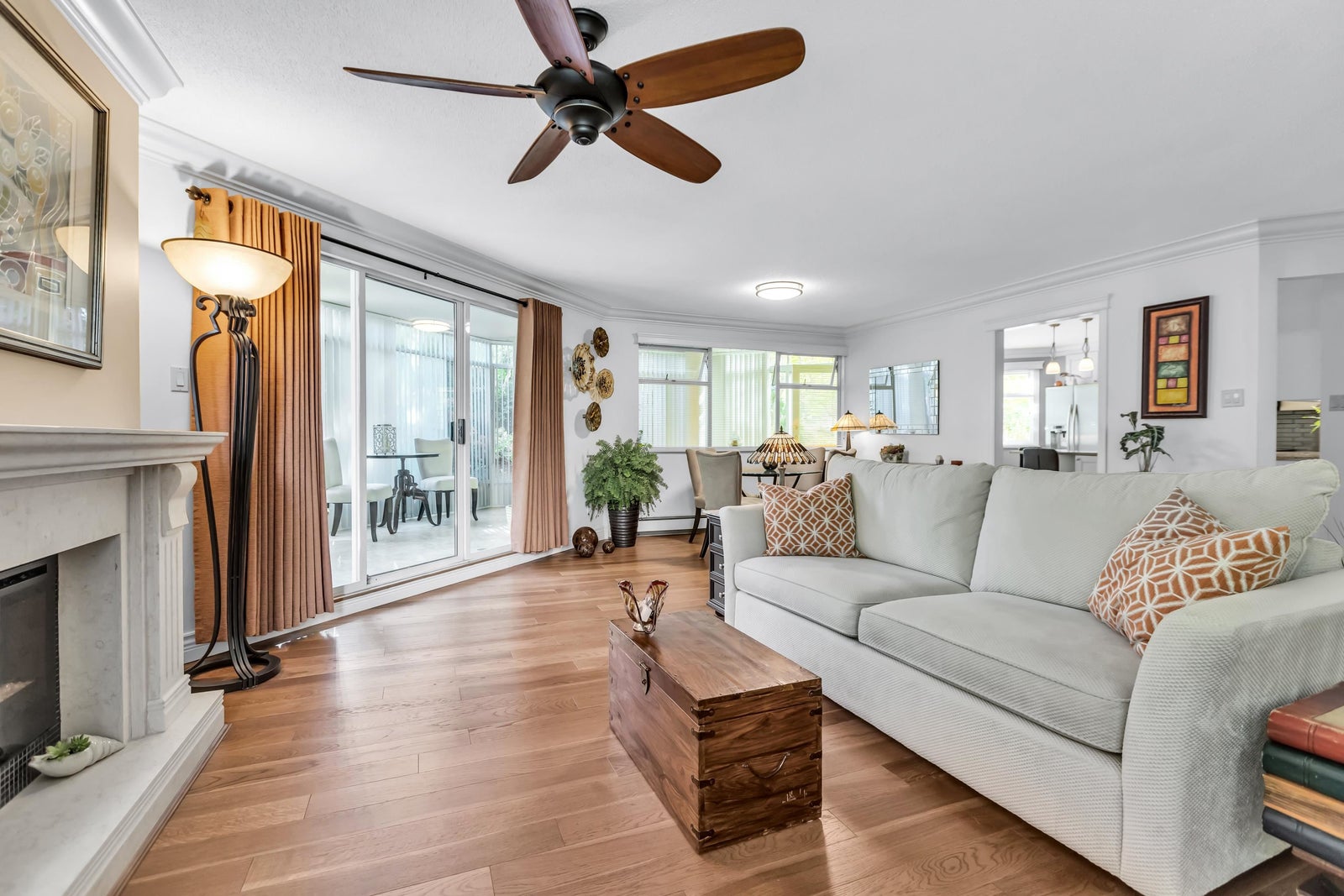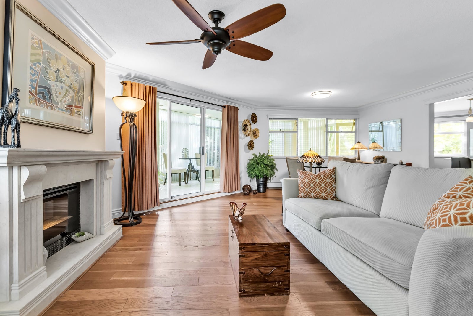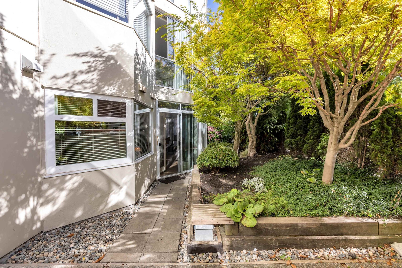 Experience rancher-like living in this beautifully renovated 1441 SF ground floor condo. Equipped with 2 bedrooms (huge master), 2 bathrooms, a large laundry room, wide hallways & spacious living areas. Quality materials & craftsmanship in the extensive millwork, oak hardwood flooring & solid marble fireplace surround. Upgraded chefs kitchen with solid maple cabinets, quartz countertops & premium SS appliances. South East exposure, surrounded by mature landscaping for optimal privacy and tranquility, whether you're looking out of your oversized windows, enjoying the 209 SF solarium or lounge on the walk out patio. Desirable concrete construction, proactive strata. Central to shops, restaurants, Peace Arch Hospital & a short walk to the Beach. One owner must be 55+. Make this your home!
