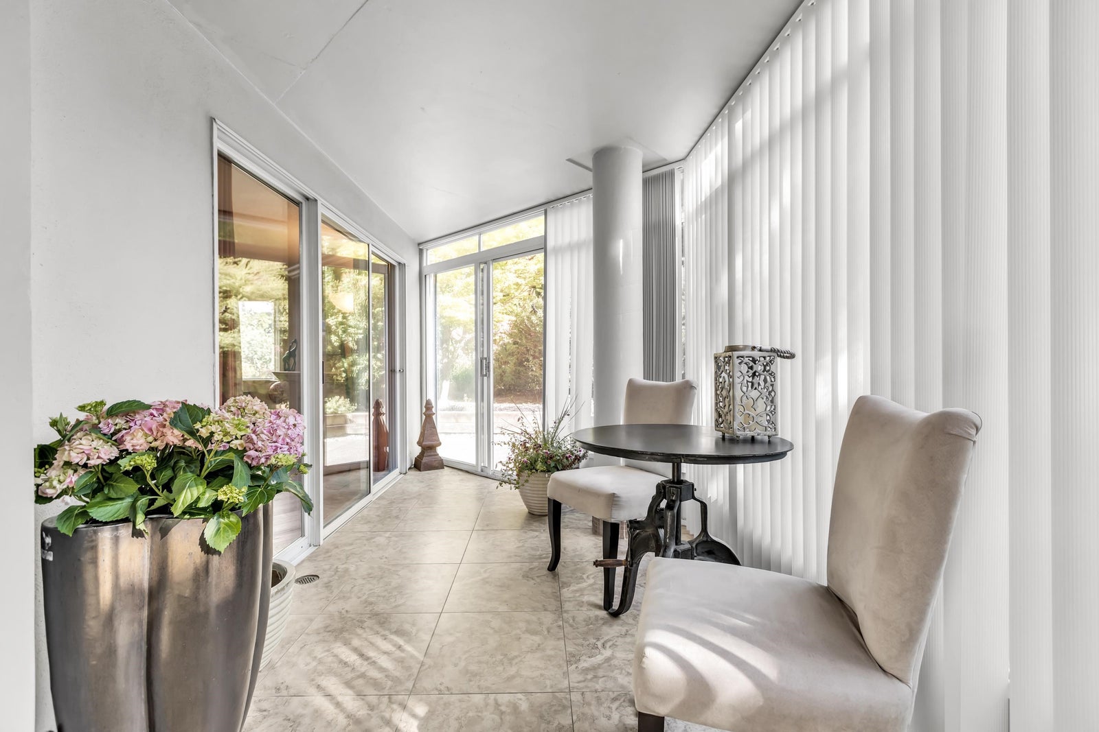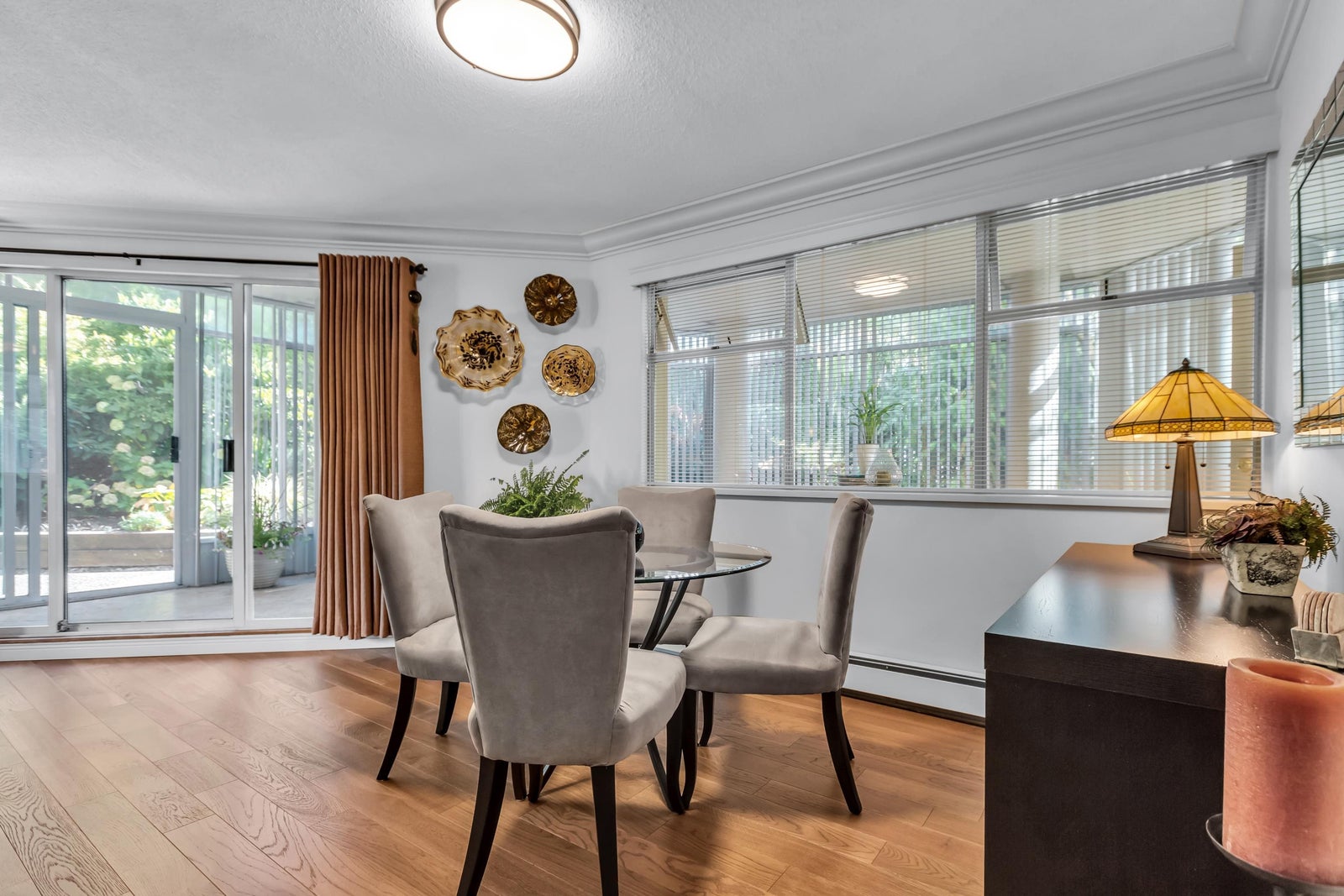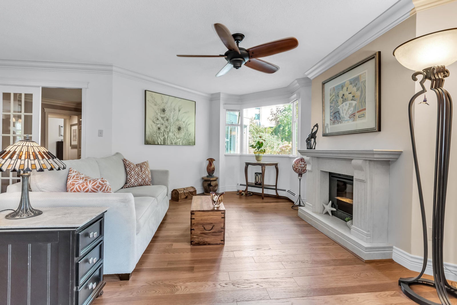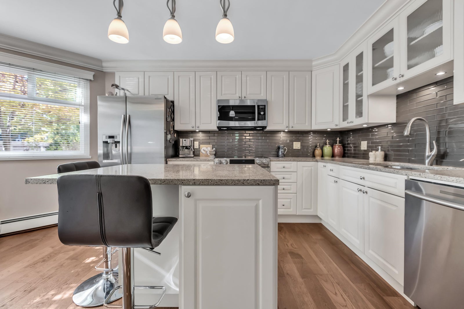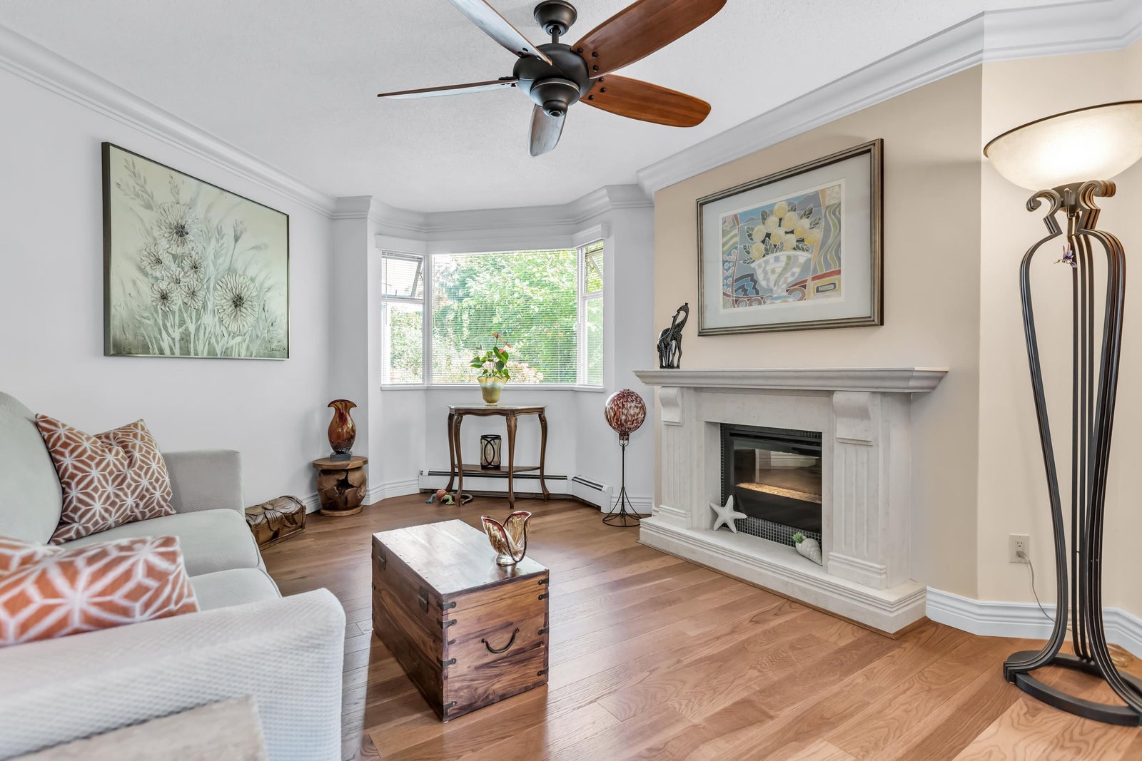 Experience rancher-like living in this beautifully renovated 1441 SF ground floor condo. Equipped with 2 bedrooms (huge master), 2 bathrooms, a large laundry room, wide hallways & spacious living areas. Quality materials & craftsmanship in the extensive millwork, oak hardwood flooring & solid marble fireplace surround. Upgraded chefs kitchen with solid maple cabinets, quartz countertops & premium SS appliances. South East exposure, surrounded by mature landscaping for optimal privacy and tranquility, whether you're looking out of your oversized windows, enjoying the 209 SF solarium or lounge on the walk out patio. Desirable concrete construction, proactive strata. Central to shops, restaurants, Peace Arch Hospital & a short walk to the Beach. One owner must be 55+. Make this your home!