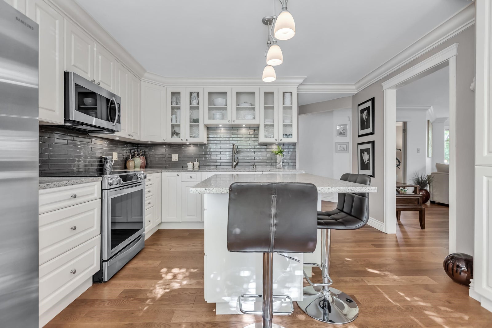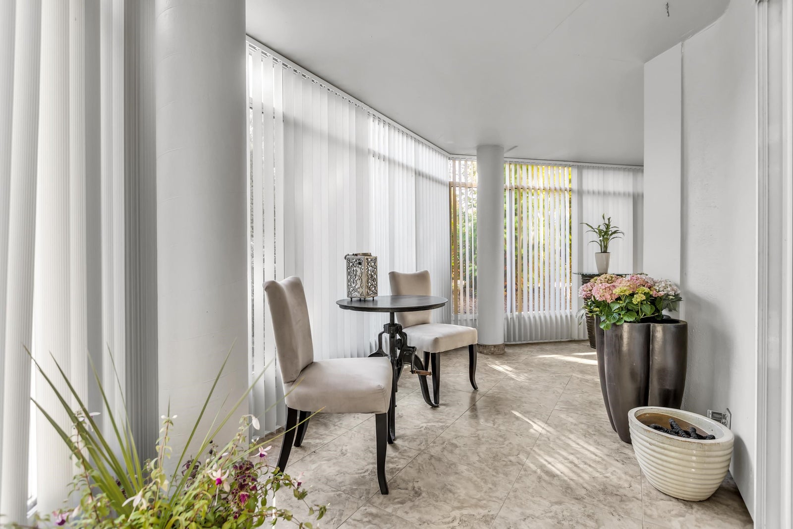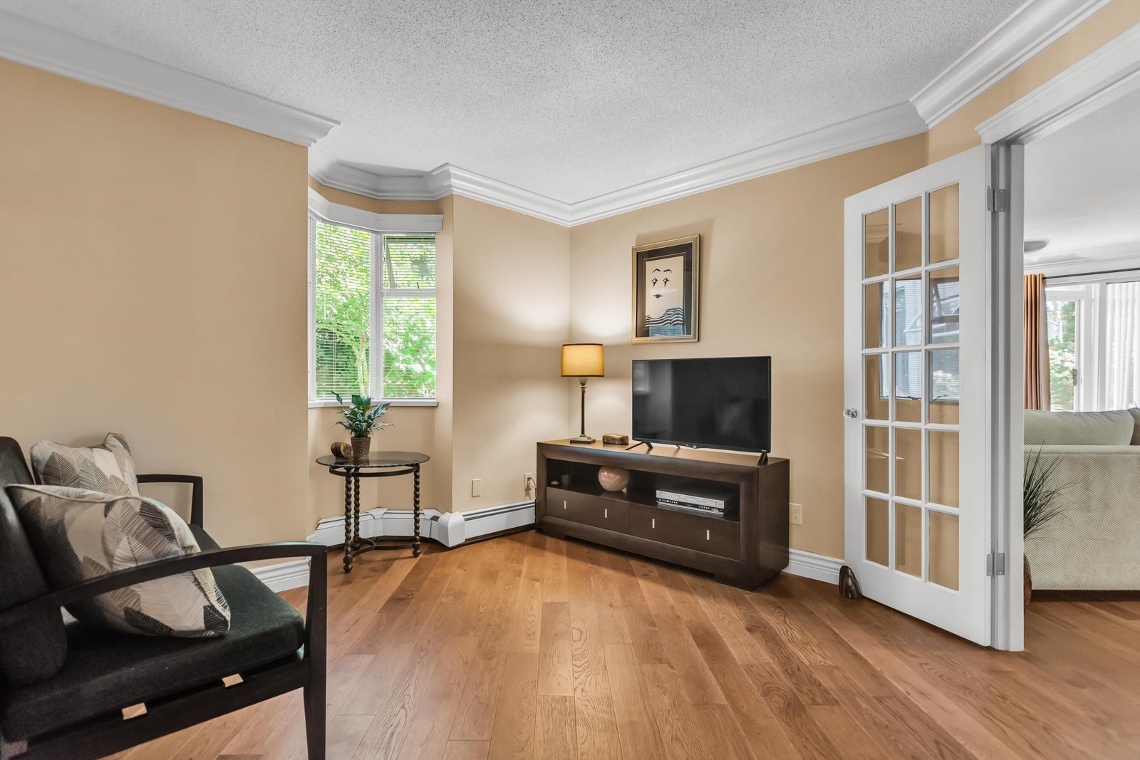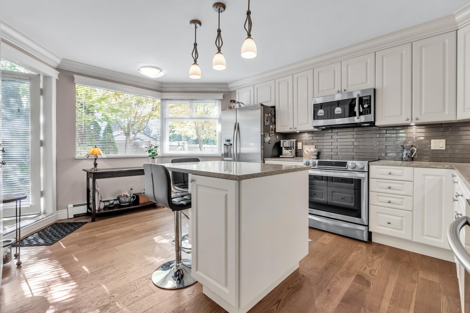 Experience rancher-like living in this beautifully renovated 1441 SF ground floor condo. Equipped with 2 bedrooms (huge master), 2 bathrooms, a large laundry room, wide hallways & spacious living areas. Quality materials & craftsmanship in the extensive millwork, oak hardwood flooring & solid marble fireplace surround. Upgraded chefs kitchen with solid maple cabinets, quartz countertops & premium SS appliances. South East exposure, surrounded by mature landscaping for optimal privacy and tranquility, whether you're looking out of your oversized windows, enjoying the 209 SF solarium or lounge on the walk out patio. Desirable concrete construction, proactive strata. Central to shops, restaurants, Peace Arch Hospital & a short walk to the Beach. One owner must be 55+. Make this your home!