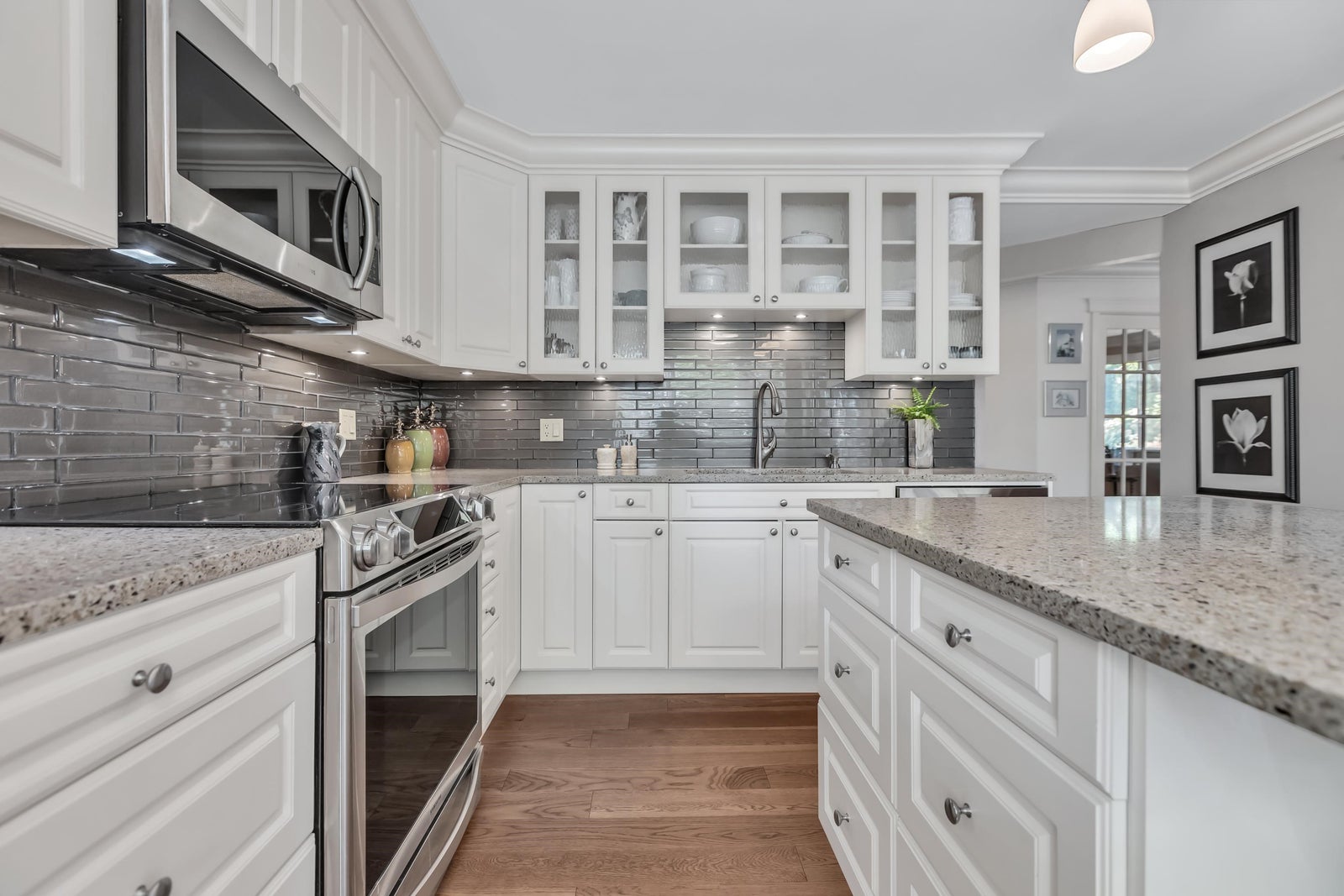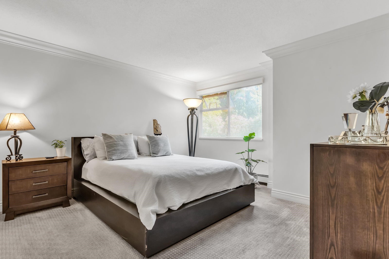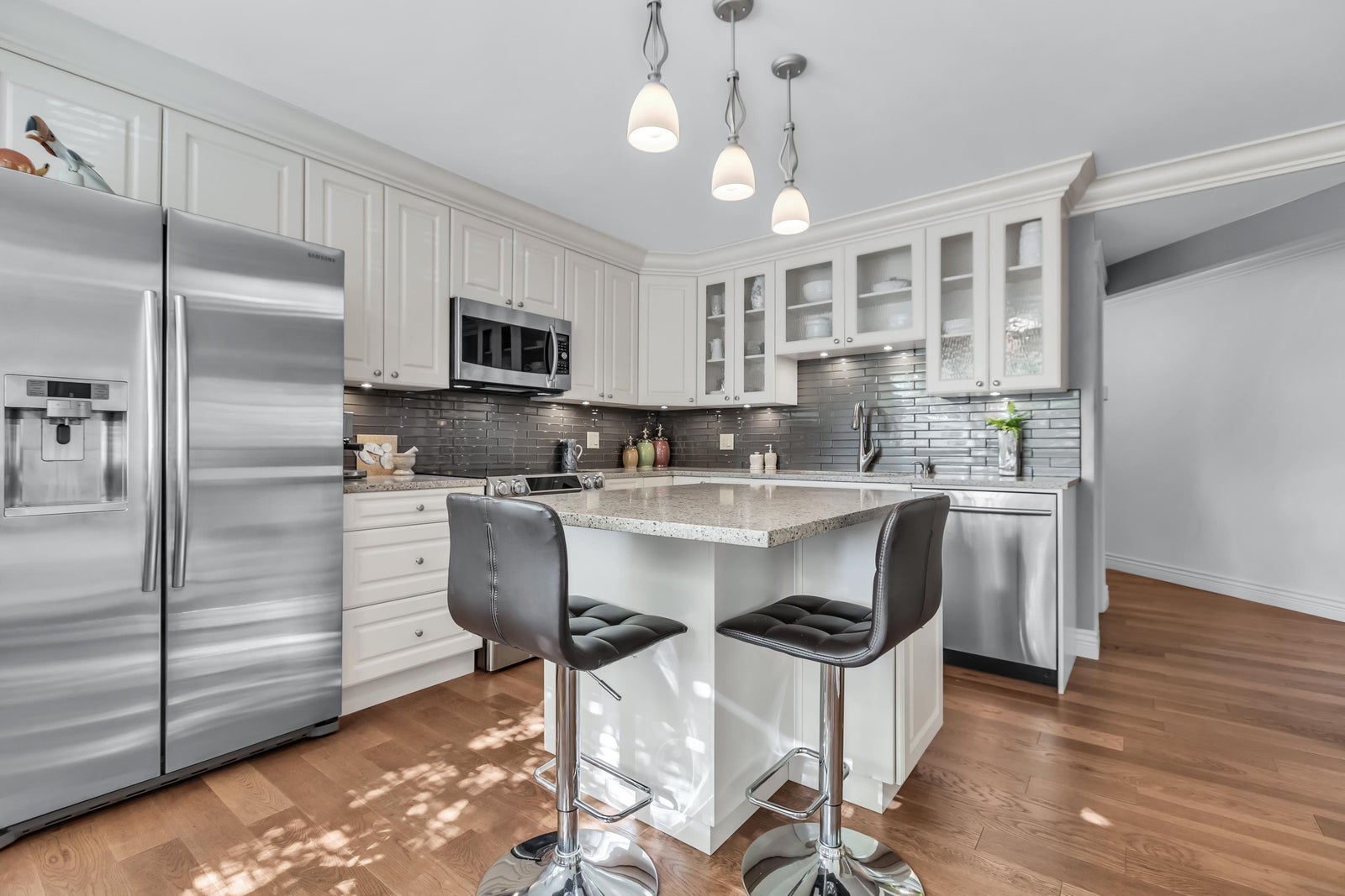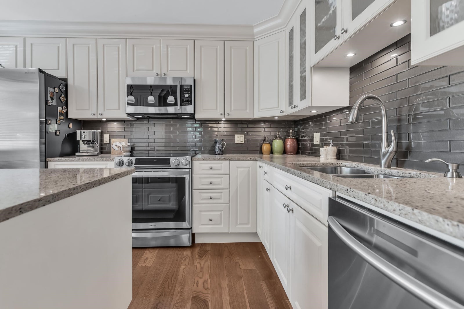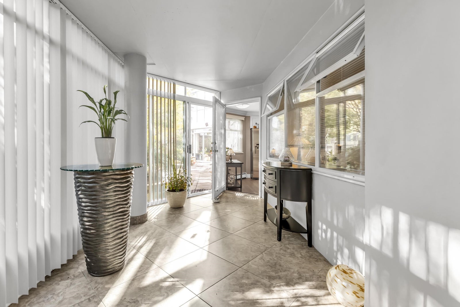 Experience rancher-like living in this beautifully renovated 1441 SF ground floor condo. Equipped with 2 bedrooms (huge master), 2 bathrooms, a large laundry room, wide hallways & spacious living areas. Quality materials & craftsmanship in the extensive millwork, oak hardwood flooring & solid marble fireplace surround. Upgraded chefs kitchen with solid maple cabinets, quartz countertops & premium SS appliances. South East exposure, surrounded by mature landscaping for optimal privacy and tranquility, whether you're looking out of your oversized windows, enjoying the 209 SF solarium or lounge on the walk out patio. Desirable concrete construction, proactive strata. Central to shops, restaurants, Peace Arch Hospital & a short walk to the Beach. One owner must be 55+. Make this your home!