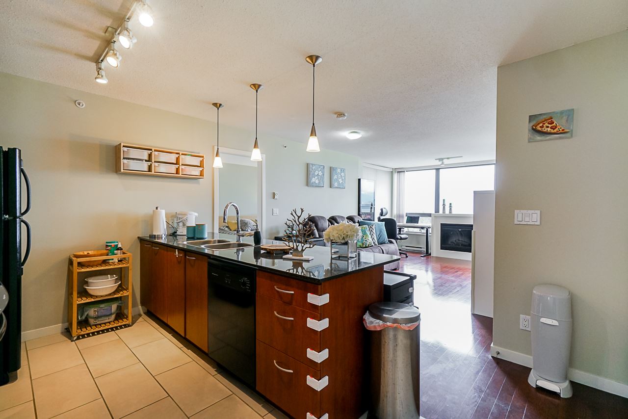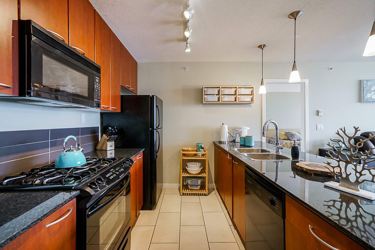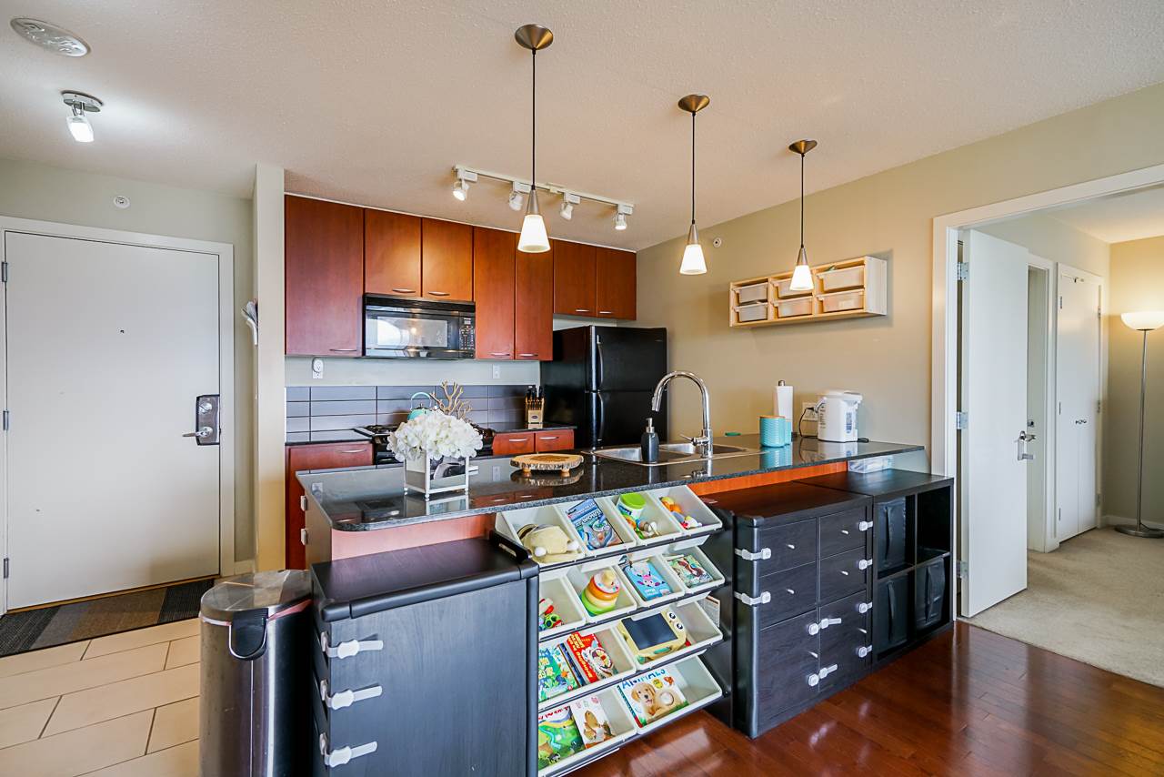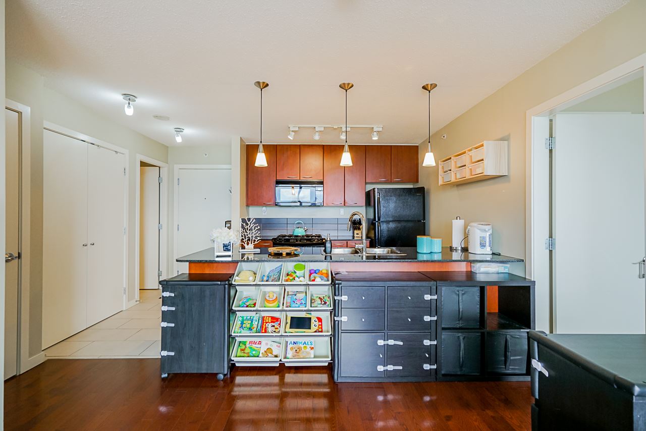 This "Hidden Gem" built by reputable Builder- BOSA, "Arcadia West"-located in a Vibrant and Super convenient family neighborhood. Very open floor plan with two separated bedrooms well for privacy featuring high quality hardwood floors, granite countertops, gas stove and a fireplace. Great layout with double balconies and very large windows, Awesome Mountain & City View. Double Vanity in Master ensuite.Walk to Save-On-Food Supermarket, Gym, Yoga, Starbucks, Bakery, Cora. RCMP office just around the corner for peace of mind.One parking & one locker. Priced to sell! Call to book a private showing!